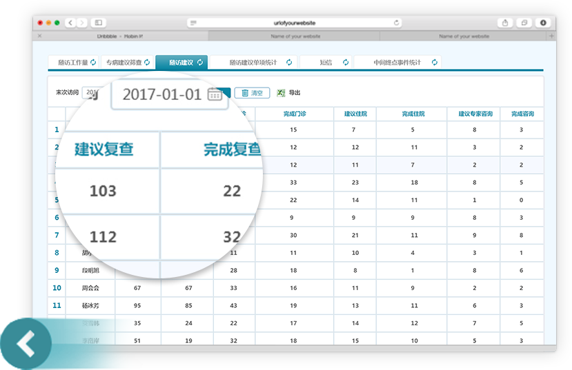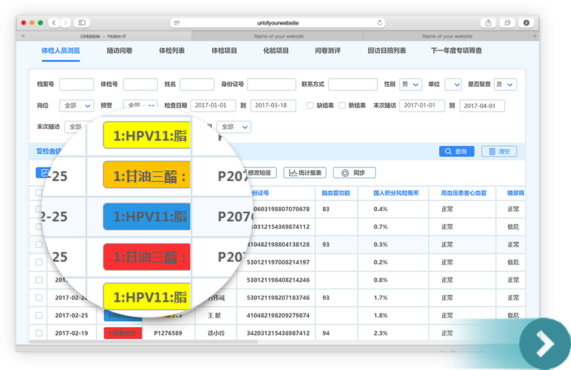 每单体检客户咨询实时可查、建议复查统计、完成复查率、建议二次筛查